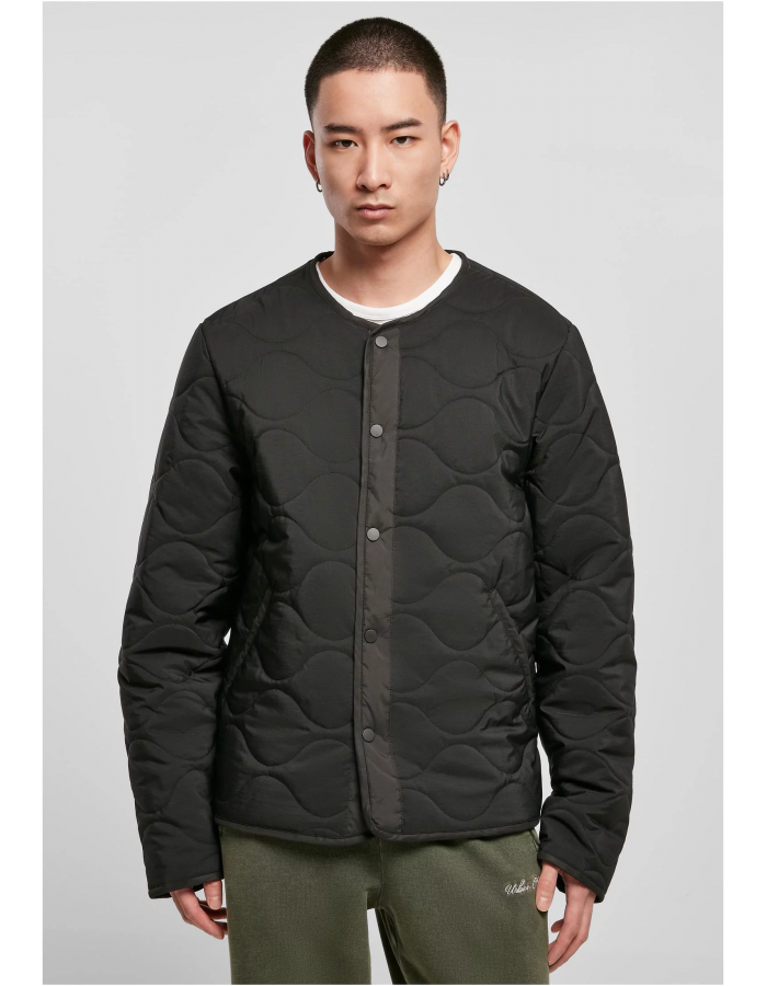 A simple and straightforward quilted jacket for men. Made from three different materials let´s appear the jacket vivid. It is equipped with two side pockets and one pocket on the inside, is collarless and fastens with a metallic snap button facing. The fit is regular and the jacket is made of polyester and lined with taffeta.
