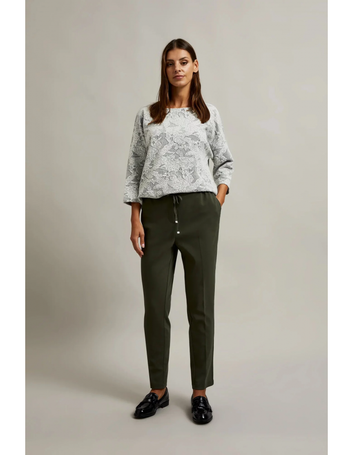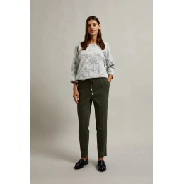 65%BAWEŁNA, 32%POLIESTER, 3%ELASTAN Spodnie damskie w kolorze oliwkowym bez wzoru, wykonane z przyjemnej w dotyku bawełny. Elastyczna guma w talii zapewnia wygodę noszenia, a dodatkowe wiązanie umożliwia idealne dopasowanie do sylwetki. Krój w kant sprawia, że spodnie prezentują się elegancko, a fason cygaretki dodaje im modnego charakteru. Idealne na wiele okazji, zarówno te codzienne, jak i bardziej formalne. Te spodnie świetnie będą pasować zarówno do casualowych bluzek, jak i eleganckich koszul. Świetnie sprawdzą się jako element zarówno codziennej, jak i biurowej garderoby. Idealnie podkreślą sylwetkę i dodadzą charakteru każdej stylizacji.